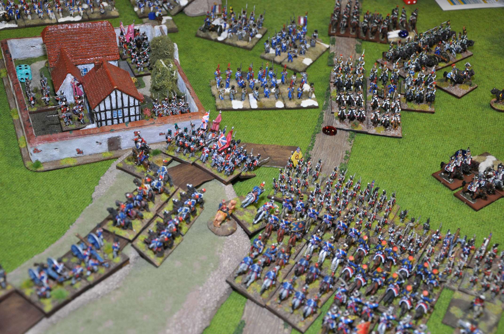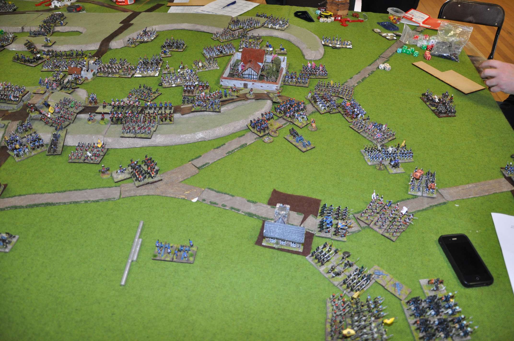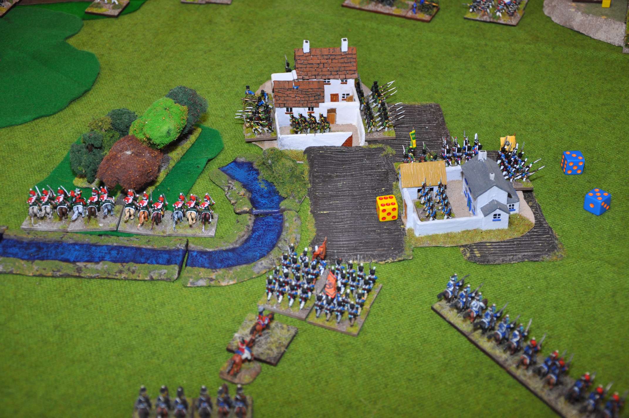 2011 refight During the playtesting phase of FOGN in 2011, we had a game with seven players involved, using 4300 points of French, 3200 points of Allies and 1900 points of Prussians (of whom only about 600 points arrived on the table). Many of the figures had only recently been painted and based, and the terrain was specially constructed for the game. We played from 9am to 9pm with some meal breaks, and had a great game.