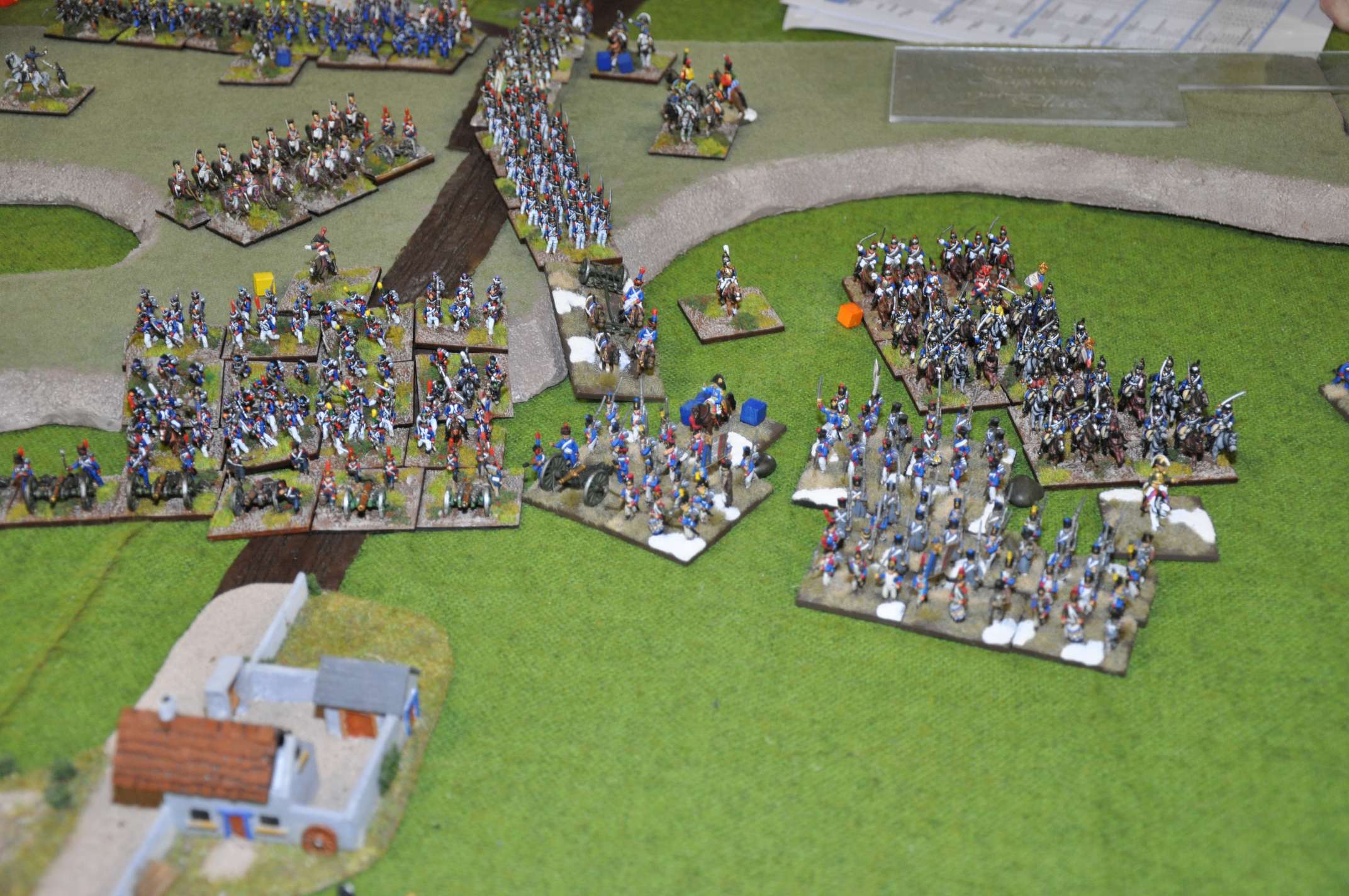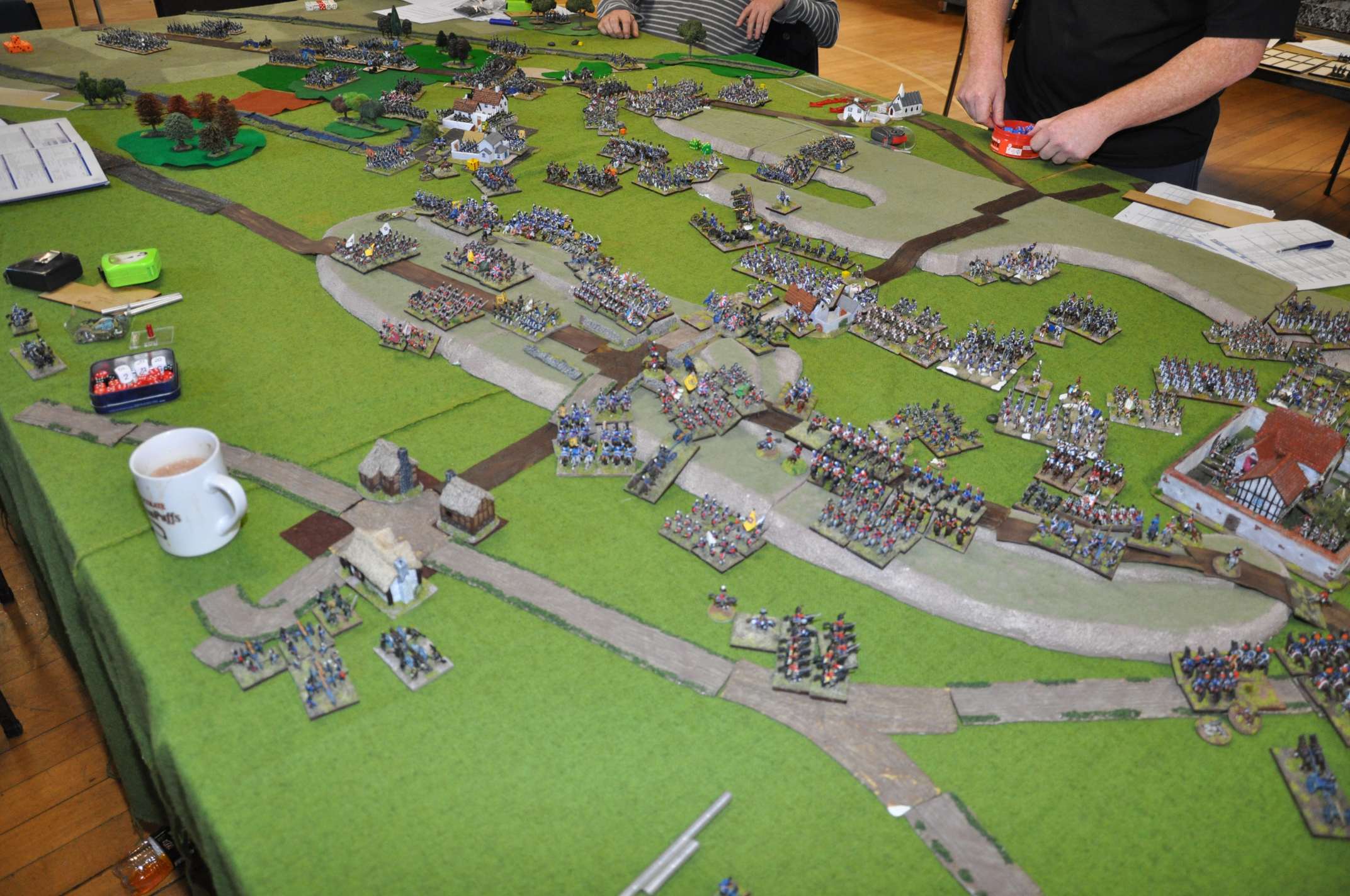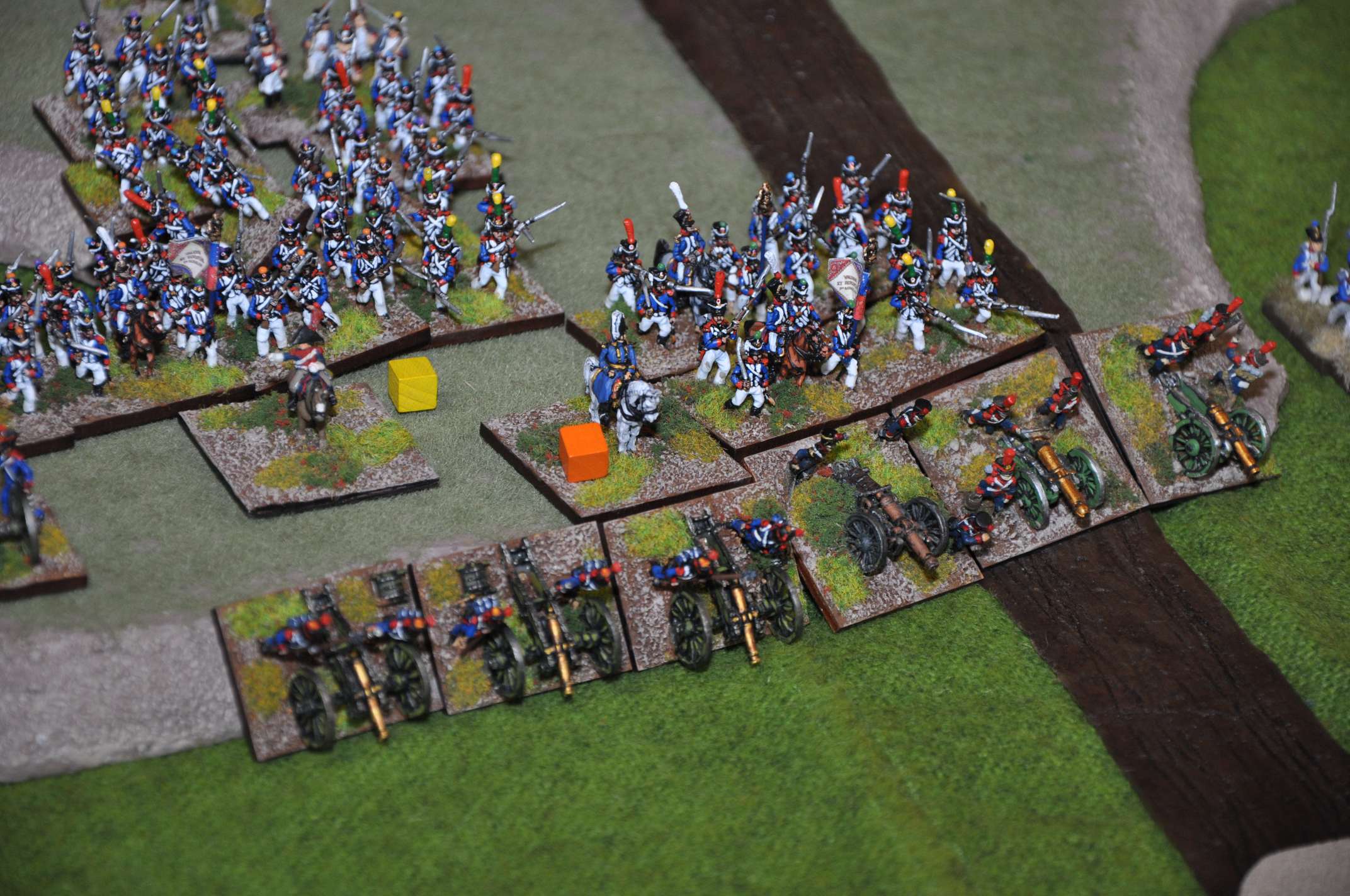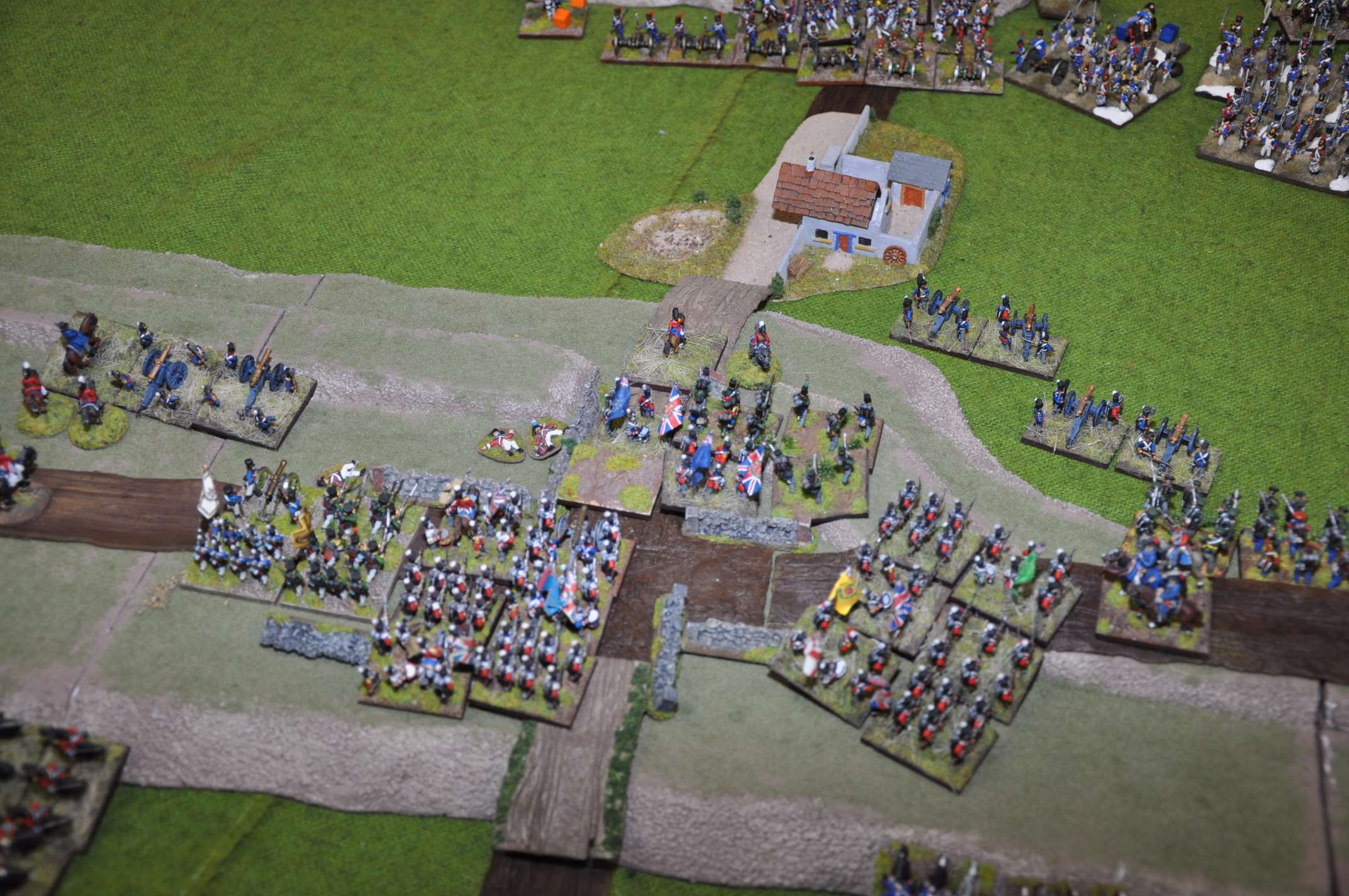 2011 refight During the playtesting phase of FOGN in 2011, we had a game with seven players involved, using 4300 points of French, 3200 points of Allies and 1900 points of Prussians (of whom only about 600 points arrived on the table). Many of the figures had only recently been painted and based, and the terrain was specially constructed for the game. We played from 9am to 9pm with some meal breaks, and had a great game.